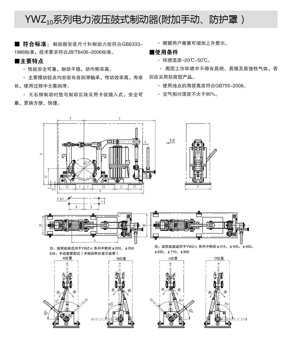 YWZ10系列电力液压鼓式制动器的连接尺寸和制动力矩参数符合GB6333-86标准,技术要求符合JB / T6406-2006标准,配套符合DIN15430标准的Ed系列推动器。