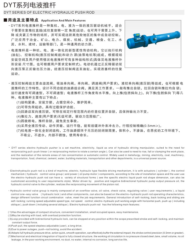 DYT系列电液推杆是一种集机、电、液为一体的液压驱动装置,可广泛用于冶金、建材、化工、起重运输及港口装卸机械中的阀门、闸门、换向、倾转、摆动等机械的驱动和控制,可取代传统的电动推杆、液压缸(由液压站驱动)和气缸(由气泵站驱动控制)。